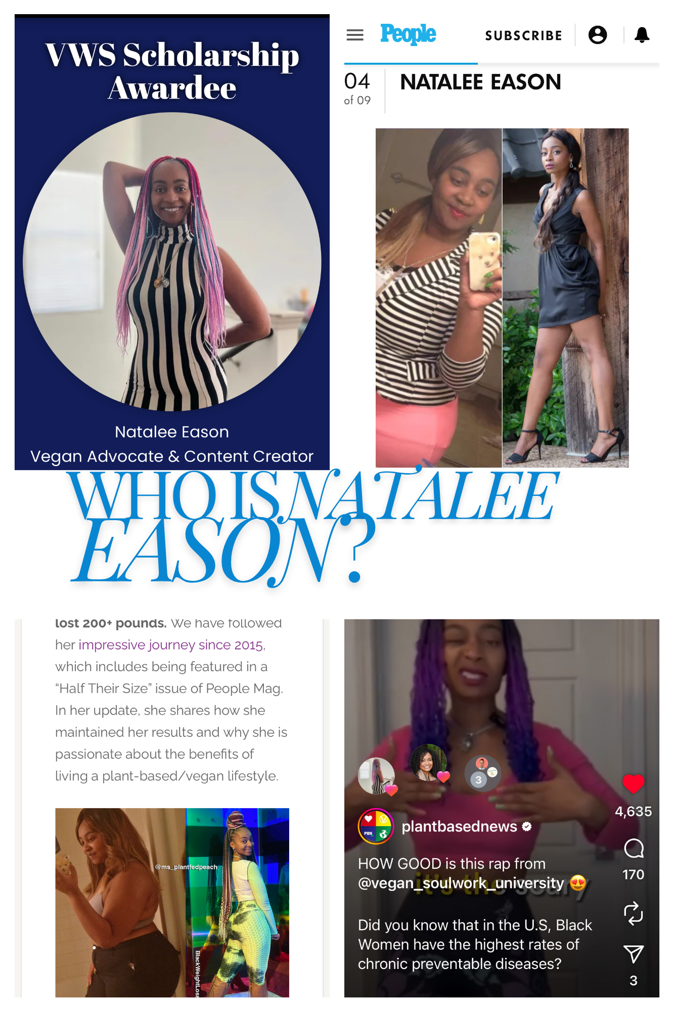 A lifelong creative and advocate, Natalee was featured by People Magazine for her all-natural weight-loss story, later honored as a Vegan Women’s Summit scholarship awardee, featured by Plant Based News (1.3 million followers) for her viral rap on Black women’s health and veganism, and earned second place in the global Plant-Based Treaty Dance Competition, which encouraged millions to sign the international treaty for a greener planet.
