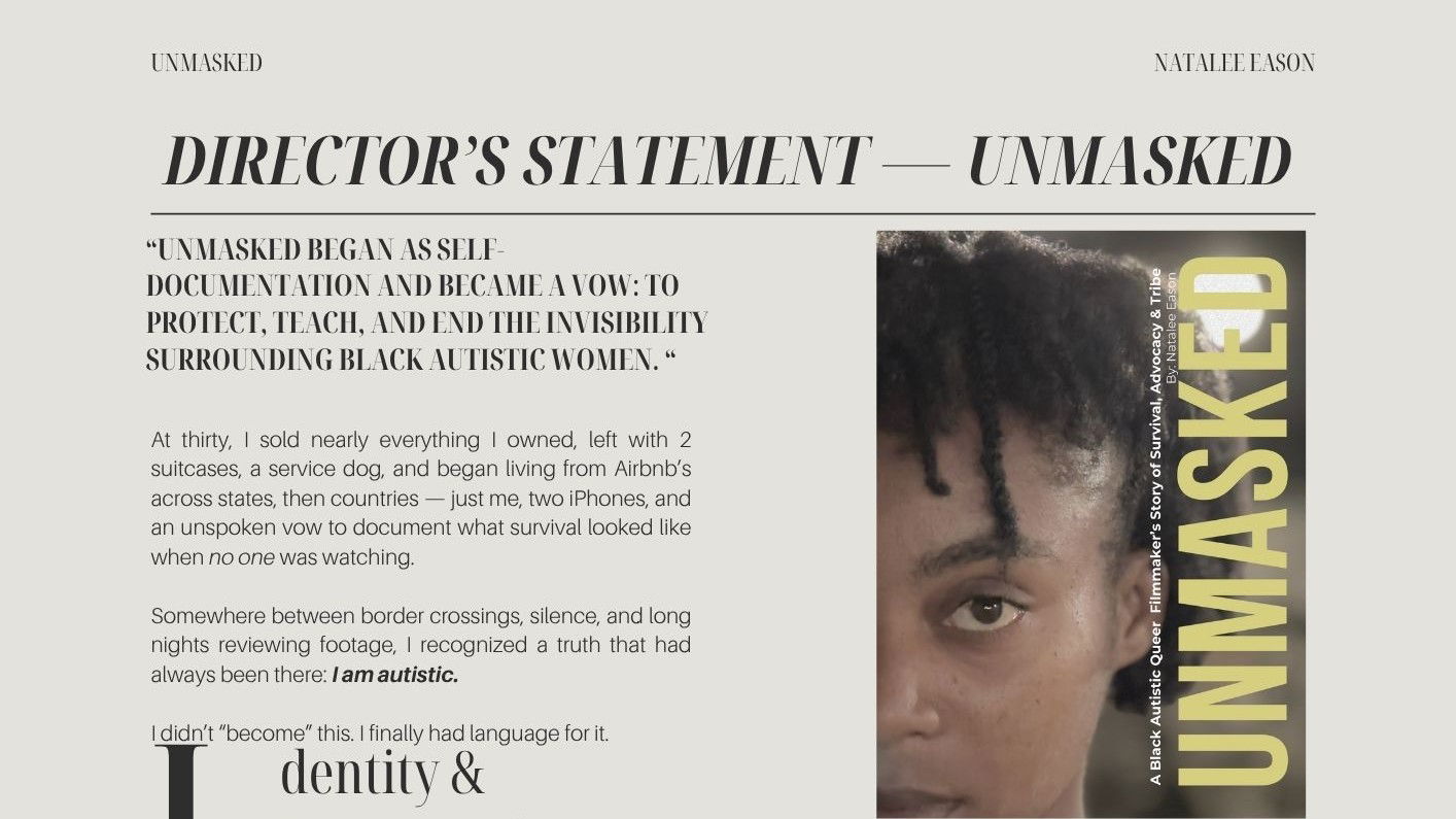 Filmed across countries and silence, UNMASKED is ancestral technology in motion — a living documentary created by a Black, Autistic, Queer, Vegan, Epileptic filmmaker, Natalee Eason and her self-trained service dog.